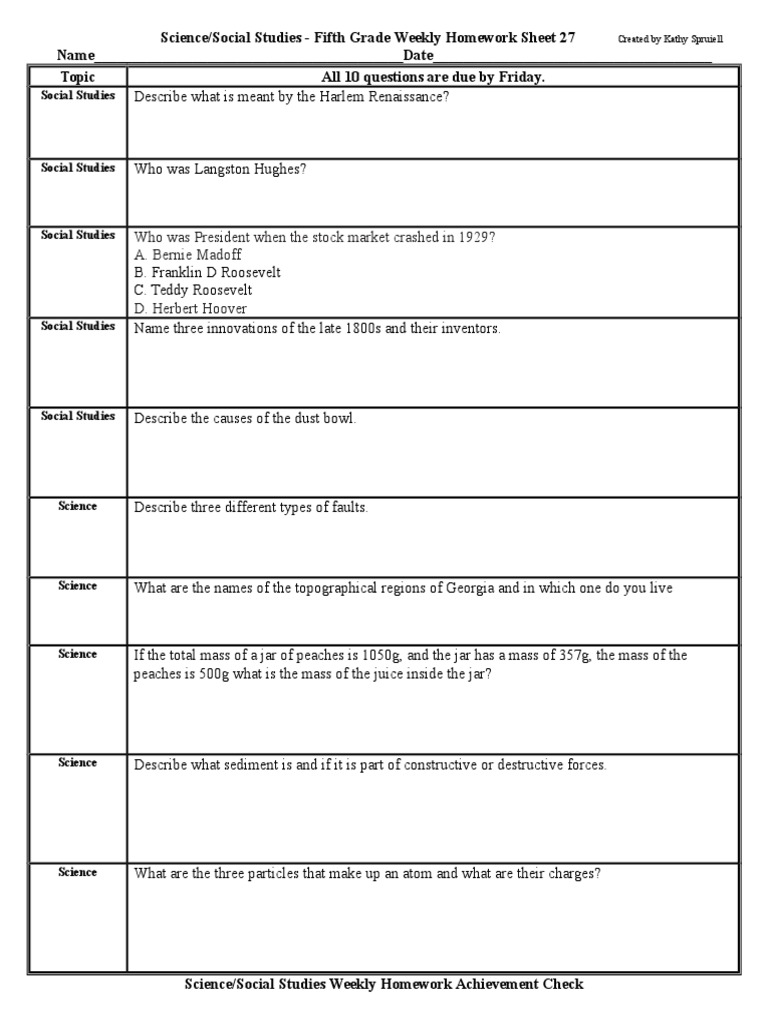 Save 20% when you buy the bundle! Use the article one nation again and your knowledge of social studies to answer this question. Science what are the three particles that make up an atom and what are their charges? Science/social studies weekly homework achievement check. In the us before week 20 or 24 depending on which state you are in.